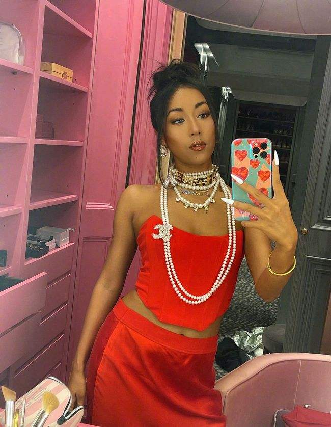 Cô ấy thường khoe dinh thự của mình từ mọi góc độ, mặc đồ đỏ và xanh lá cây, cô ấy nóng lòng treo tất cả trang sức trên người, để lộ nhiều logo lớn khác nhau.